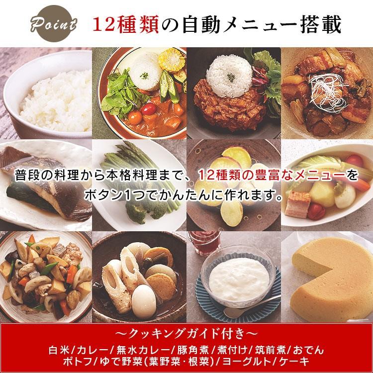 商品情報 圧力調理でいつもの調理時間を短縮できる電気圧力鍋です。 30〜100の温度調整もできる為、圧力調理だけではなく低温調理も可能。ローストビーフや鳥ハムもおいしくできます。 材料を入れてボタンを押すだけ簡単調理。12種類の自動調理メニュー搭載。 商品サイズ(cm):幅約29.3×奥行約27.6×高さ約28.4 商品重量:約3.7kg 電源:AC100V(50/60Hz共用) 定格消費電力:700W 炊飯容量:3合 最高圧力:70kPa 調理容量:約2.0L 満水容量:約3.0L 電源コード:約1.0m 自動メニュー:白米/カレー/無水カレー/豚の角煮/魚の煮付け/筑前煮/おでん/ポトフ/ヨーグルト/ゆで野菜(葉野菜)/ゆで野菜(根菜)/ケーキ 手動メニュー:圧力調理/温度調理/無水調理 温度調整:30〜100(5単位で設定可能) 予約時間:12時間 保温時間:12時間 付属品:白米用計量カップ(1合) (検索用:ナベ なべ 電気鍋 手軽 簡単 使いやすい 料理 おいしい 黒 4967576439381) |